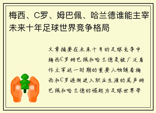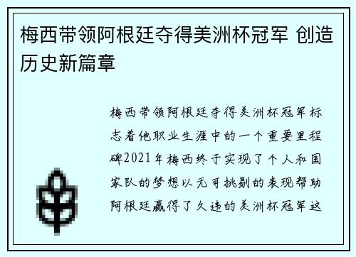 文章摘要:梅西作为阿根廷足球的象征,领衔球队在世界杯半决赛中以惊艳表现战胜巴西,成功助力阿根廷晋级决赛。此次比赛不仅是梅西个人职业生涯中的一次重要突破,更是阿根廷足球的历史性时刻。文章将从四个方面进行...